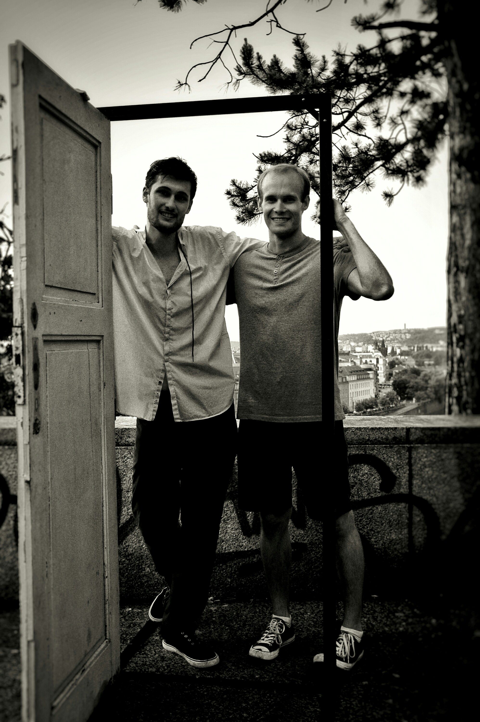 Bin der Einzige auf der Plattform. Tolle Möglichkeit für Fotos. Bis zwei Jungs sich keuchend zu mir gesellen. Sind ebenso ins Wetter gekommen. Die Wahnsinnigen haben eine Tür dabei. Ja. Richtig gelesen: eine Tür!