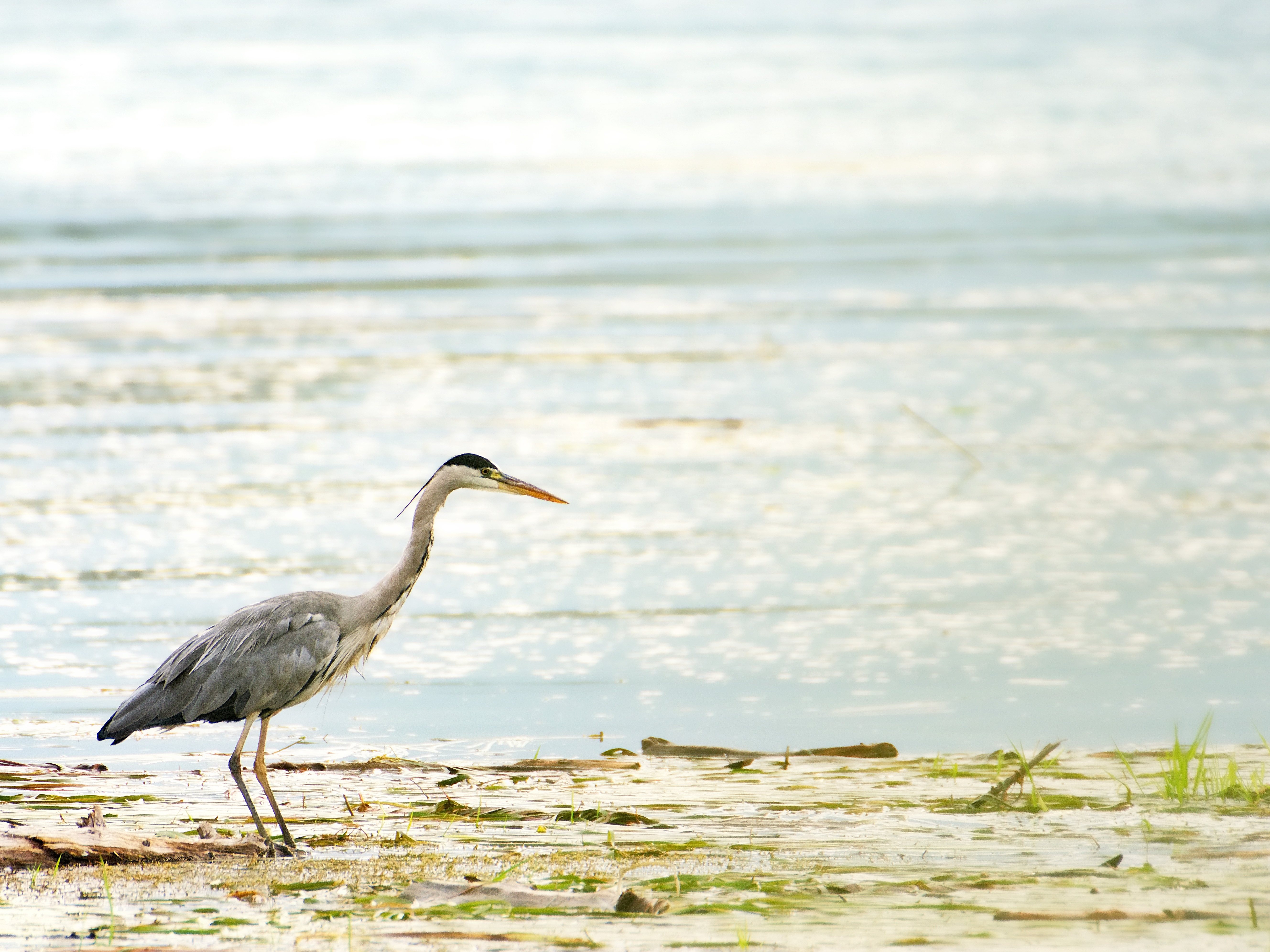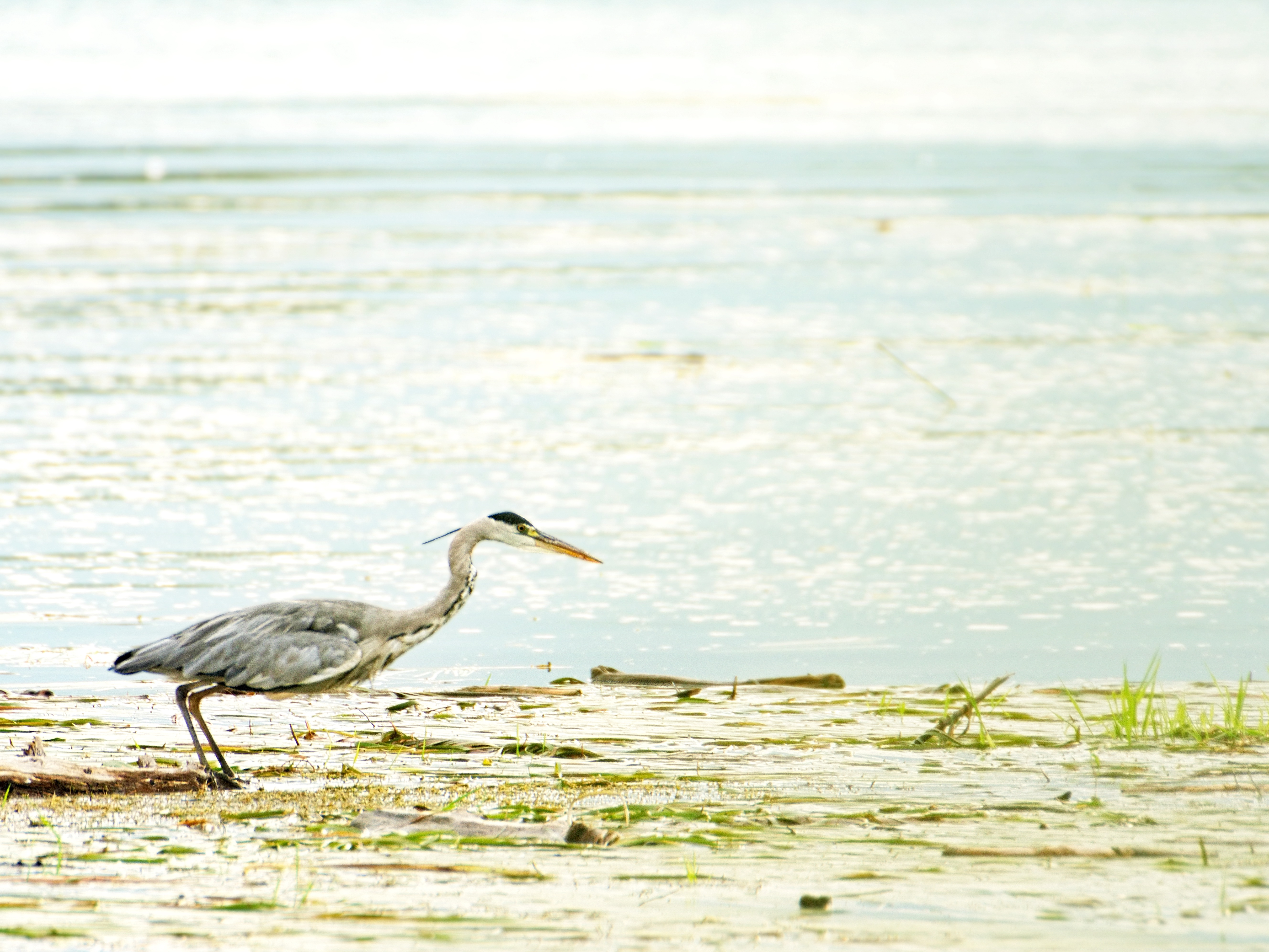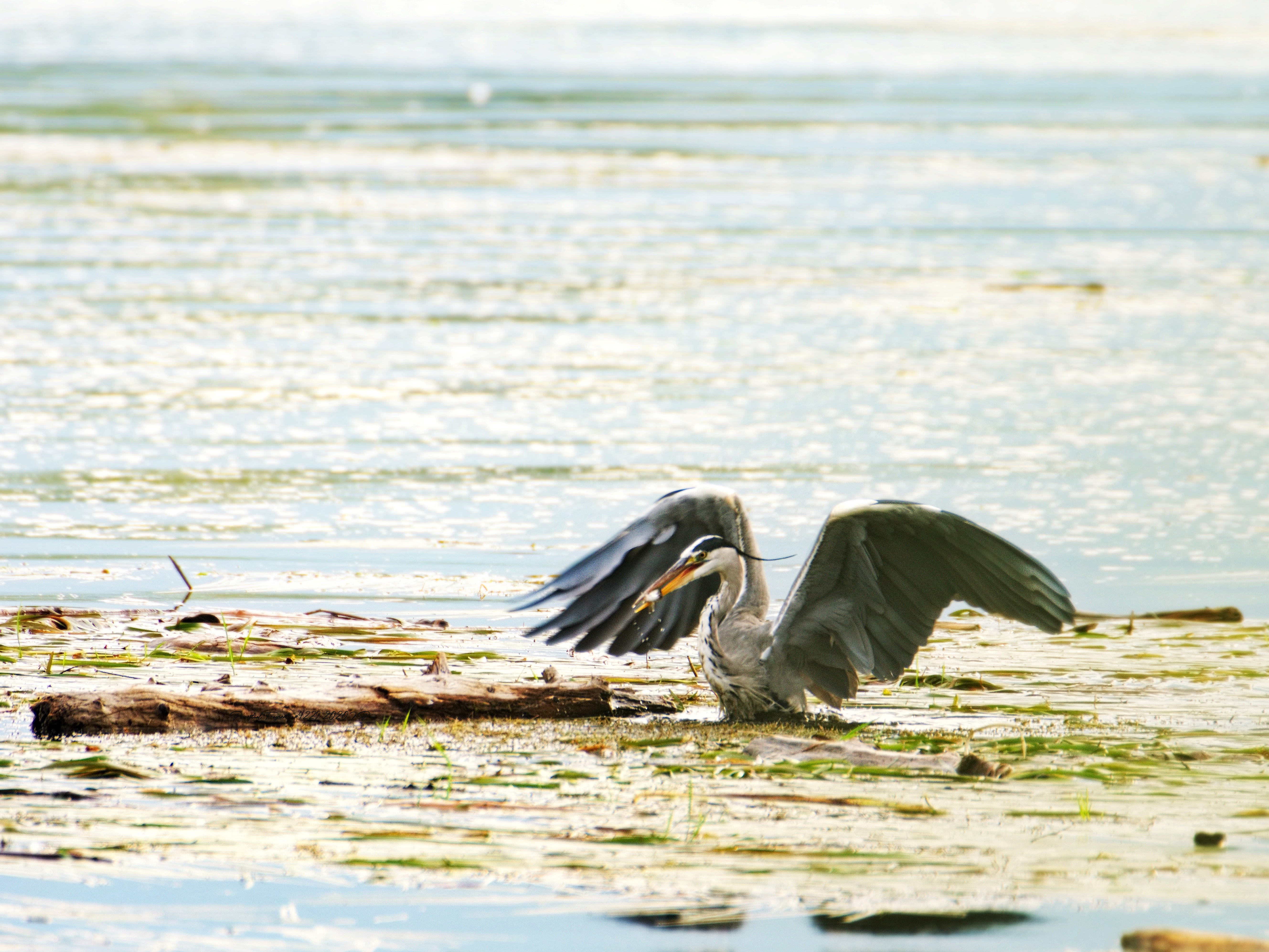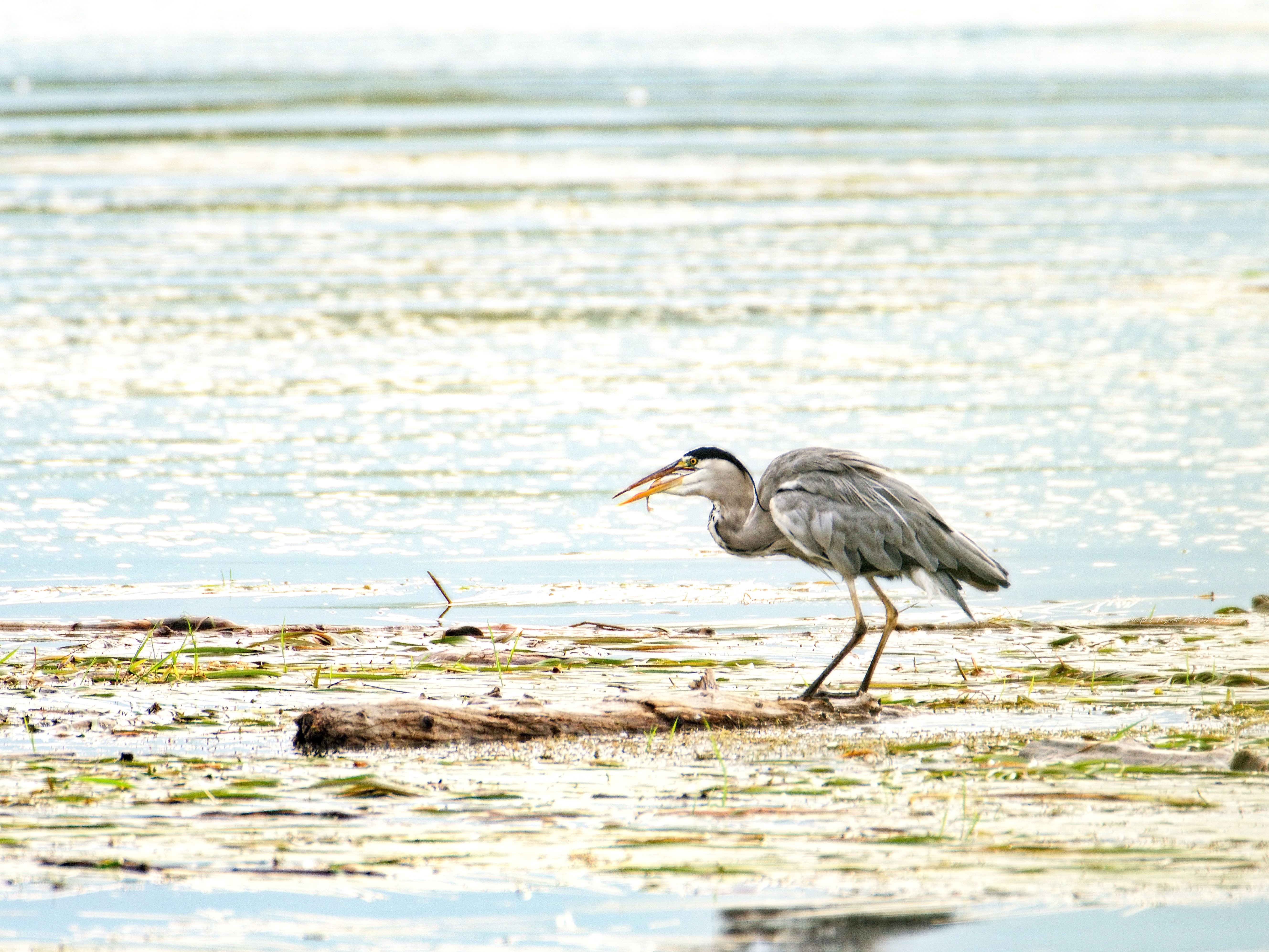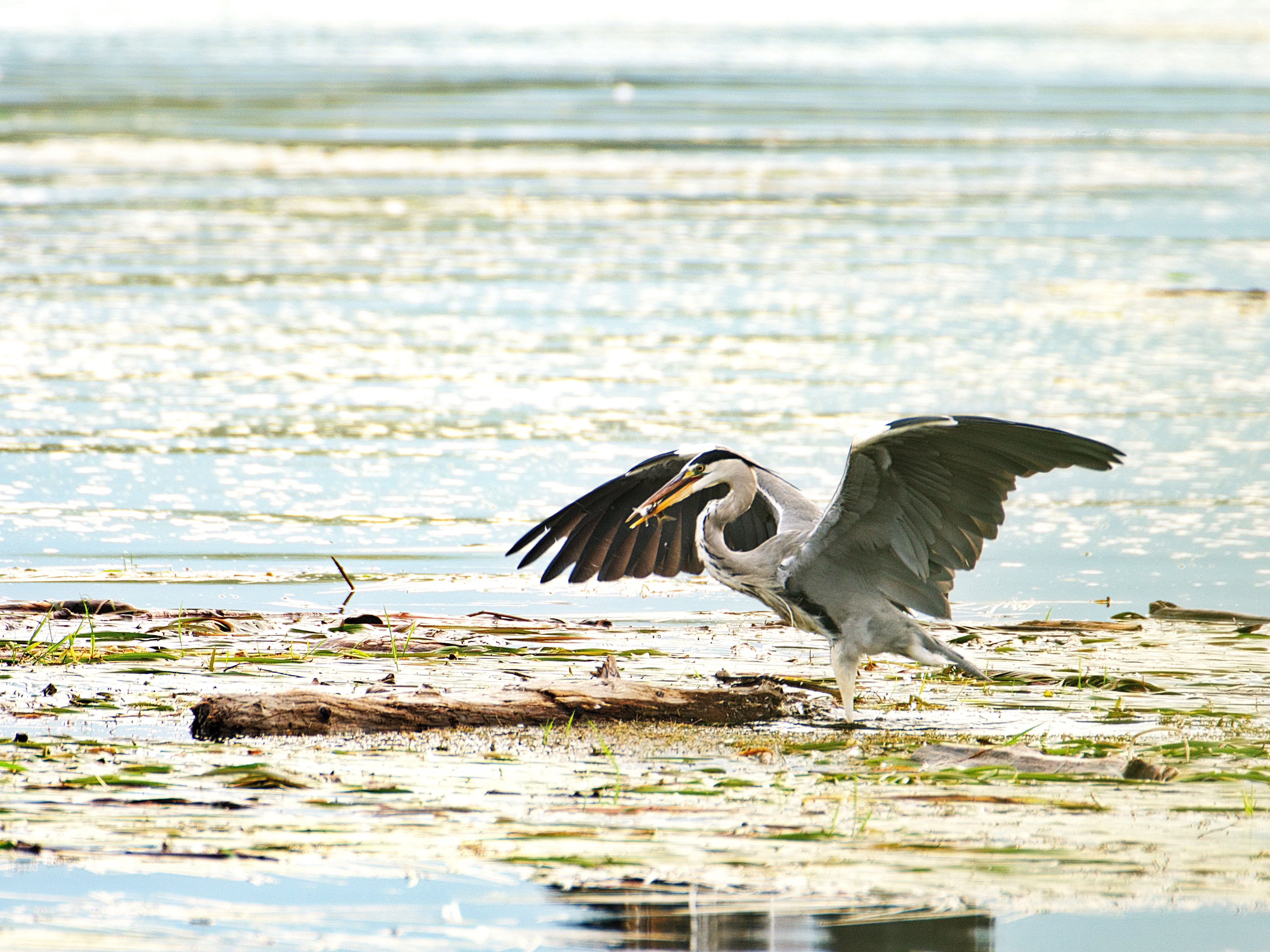 There! About 100 meters in front of me a grey heron. It remains typically motionless. Turn off the wheel. Get my camera out of the box and move slowly towards the bird. Piece by piece. He has surely already seen me. Or has he not? Another 50 meters. I take the first photos. Another 40 meters. A bush gives me some cover. I hope enough that I have a chance for a photo. My yield so far is almost zero. That would be something. The grey heron moves slowly. It seems to duck – I immediately pressed the shutter release – and then suddenly moves forward. Splash! The heron disappears into the water and then reappears with a roar. Then I see its prey, which it devours after short movements with its beak in one. It begins to puff itself up and struts around a bit before it takes off.
