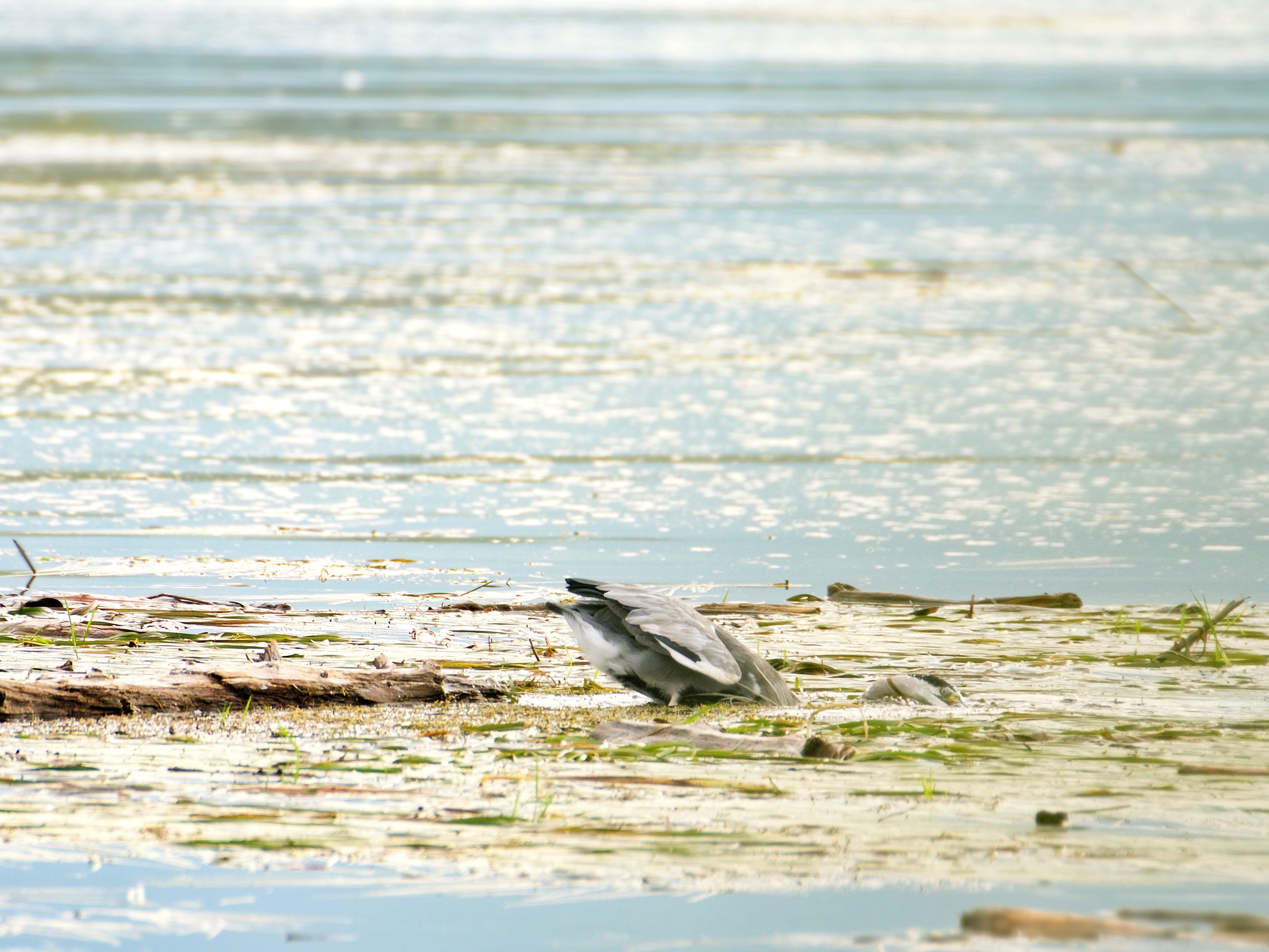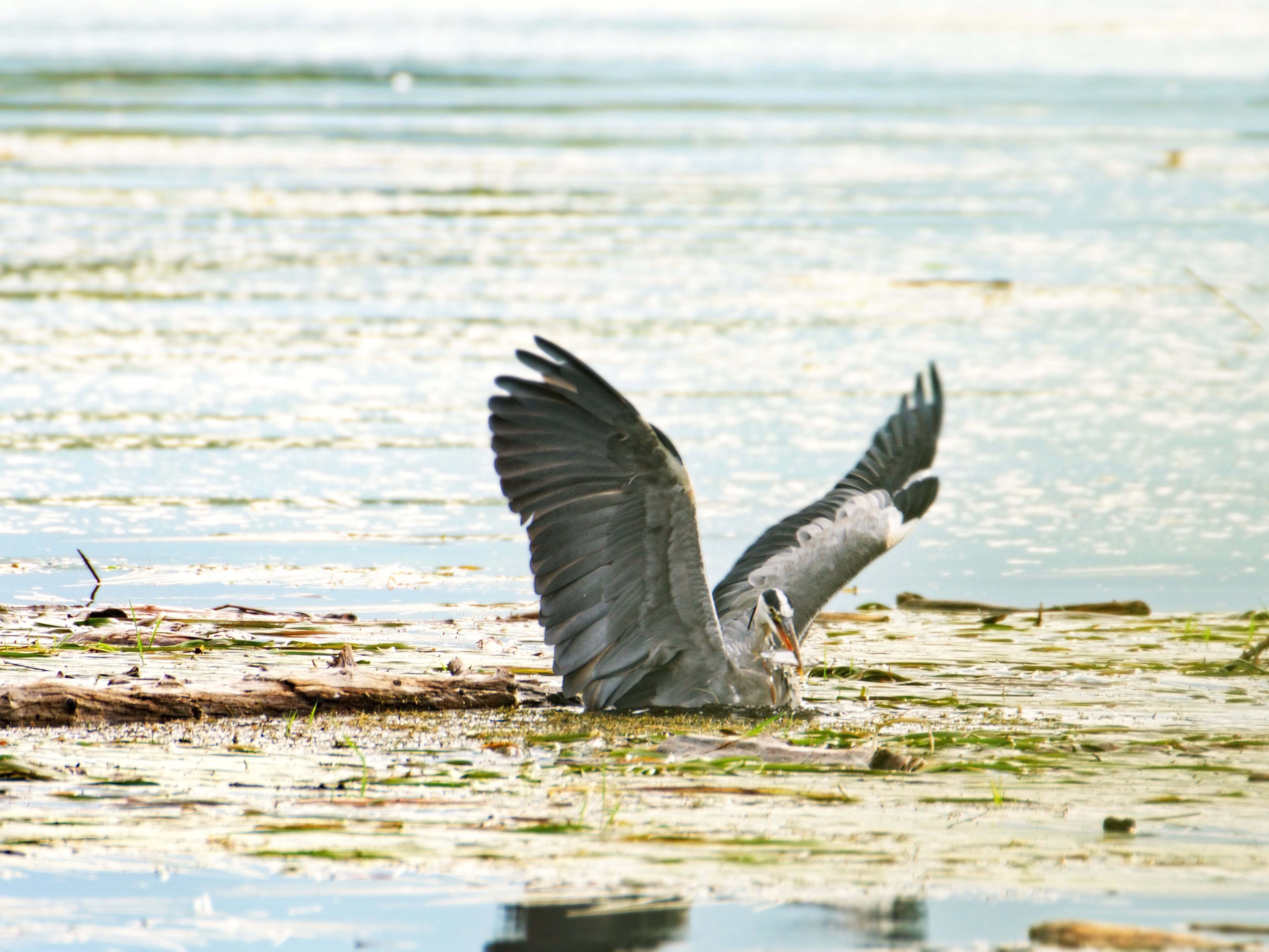 Da! Etwa 100 Meter vor mir ein Graureiher. Er verharrt arttypisch regungslos. Stelle das Rad ab. Hole meine Kamera aus der Box und bewege mich langsam in Richtung des Vogels. Stück für Stück. Er hat mich sicherlich bereits gesehen. Oder doch nicht? Noch 50 Meter. Ich mache die ersten Fotos. Noch 40 Meter. Ein Gebüsch gibt mir etwas Deckung. Ich hoffe genug, dass ich eine Chance auf ein Foto habe. Meine Ausbeute bisher geht gegen Null. Da wär‘ das schon was. Der Graureiher bewegt sich langsam. Er scheint sich zu ducken – ich sofort auf den Auslöser gedrückt – und schnellt dann plötzlich vor. Pflatsch! Der Reiher verschwindet im Wasser und taucht dann mit Getöse wieder auf. Dann sehe ich seine Beute, die er nach kurzen Bewegungen mit dem Schnabel in einem verschlingt. Er beginnt sich aufzuplustern und stolziert noch etwas herum bevor er abhebt.